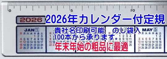 オフィス・作業所等で使用頻度の高い30cm定規に、 2026年のカレンダーと貴社名・ご住所等を印刷したもので、 自然と貴社名等が目に入り宣伝効果を得られるものです。 定規は手元にあるとなにかと用途が多く、 贈る方にも贈られる方にも大変喜ばれております。 |