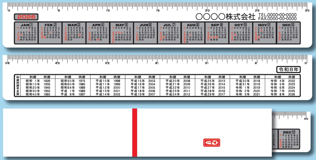 | オフィス・作業所等で使用頻度の高い30cm定規に、 2026年のカレンダーと貴社名・ご住所等を印刷したもので、 自然と貴社名等が目に入り宣伝効果を得られるものです。 定規は手元にあるとなにかと用途が多く、 贈る方にも贈られる方にも大変喜ばれております。 | ||